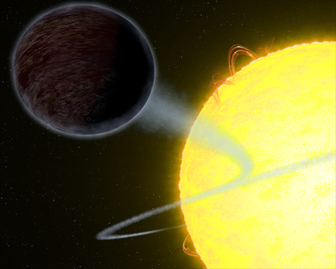 WASP-12b est l’une des plus sombres exoplanètes, aussi noire qu’une route fraichement pavée. L’exoplanète, qui fait deux fois la taille de Jupiter, a la propriété unique d’absorber au moins 94% de la lumière visible qu’elle reçoit de son étoile. La planète est si proche de son étoile qu’elle lui montre toujours la même face. Le côté jour reçoit toute la lumière puisqu’il fait toujours face à l’étoile. Un tourbillon de matière de son atmosphère surchauffée est aspiré par l’étoile.