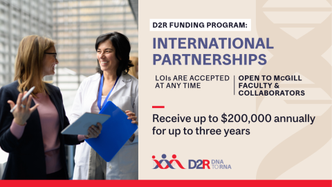 D2R | DNA to RNA is launching the International Partnerships Program (IPP) to strengthen large-scale, multi-institutional collaborations with leading global organizations. This strategic funding program supports partnerships that align with D2R’s mission, offer complementary expertise, and provide enriched, multidisciplinary training environments. The program will prioritize initiatives with strong institutional commitment, alignment with D2R’s research priorities, and potential for high global impact.