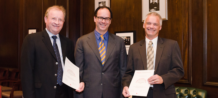 Le 15 novembre, 2013, dans le cadre du 11e Colloque annuel des professeurs des sûretés réelles, Marc Boudreault, Charles Belleau, et Jacques Deslauriers (qui n'a pu se joindre à nous) ont été reçus au Cercle Yves Caron.