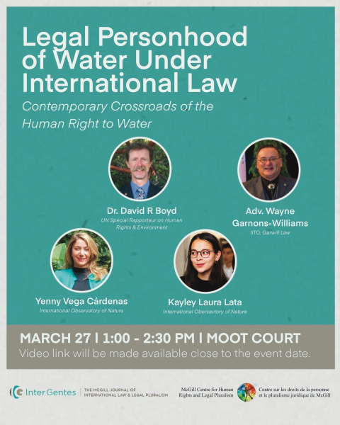 Inter Gentes and the Centre for Human Rights & Legal Pluralism are pleased to invite you to a panel discussion entitled The Contemporary Crossroads between the Human Right to Water and the Legal Personhood of Water under International Law. In acknowledgement of the World Day for Water, this event will explore both how the global climate crisis has impacted human rights to natural resources like water and how, contrary to a traditional anthroprocentric focus of the right to water, the increased legal personification of nature has inspired more pluralistic legal philosophies.