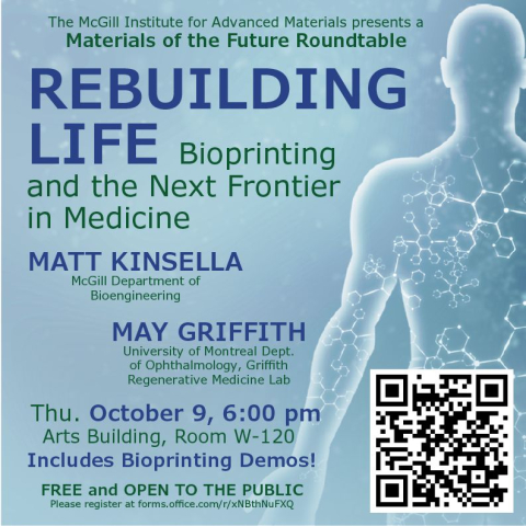 Attend our next "FUTURE OF MATERIALS" roundtable with Matt Kinsella and May Griffith on bioprinting, with demonstrations: Thu. October 9 at 6:00 pm, Arts W-120 (McGill Campus). Please register at https://lnkd.in/evAZq9uK.