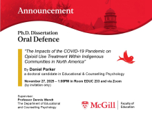 Prof. Dennis Wendt, from The Department of Educational and Counselling Psychology, is proud to announce that Daniel Parker, a doctoral candidate in Educational and Counselling Psychology, will be defending their dissertation on November 27, 2025, at 1:00 PM in Room EDUC 233 and on Zoom (by invitation only).