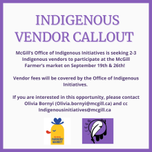 Do you have a personal business, or goods to sell? The Office of Indigenous Initiatives is seeking 2-3 Indigenous vendors to participate at the McGill Farmer's Market during Indigenous Awareness Weeks in September.