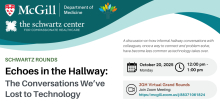 Join us for the next session of the DOM Schwartz Rounds, presented as a special edition of JGH Medical Grand Rounds via Zoom on October 20, 2025, from 12:00 to 1:00 PM. We’ll be joined by a fantastic set of panelists: Dr. Carmela Pepe, Pulmonologist and Associate Physician-in-Chief, Dr. David Hornstein, Internist, and Dr. Polymnia Galiatsatos, Gastroenterologist. Our panel will explore the topic “Echoes in the Hallway: The Conversations we’ve Lost to Technology.”
