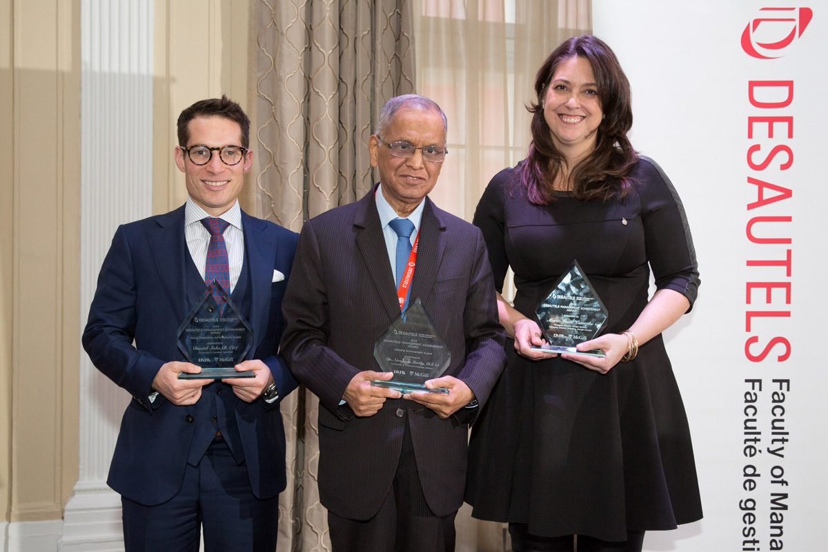 From left to right: Winners of the 2018 Desautels Management Achievement Awards (DMAA), Daniel Saks (BA’07), President and Co-CEO, AppDirect, Narayana Murthy (DSc’15), Co-Founder and Chairman Emeritus Infosys, and Marie-Josée Lamothe, Managing Director, Google QC and Managing Director Branding, Google Canada
