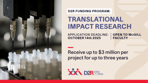 D2R | DNA to RNA is launching the next round of funding for the Translational Impact Research (TIR) program. This program supports a select few large-scale translational research projects in RNA-based therapeutics which are expected to have a measurable impact on the health of Canadians. Projects must address the D2R Initiative’s strategic priorities and priority disease areas: oncology, rare diseases, infectious diseases, cardiovascular and cardiometabolic diseases.