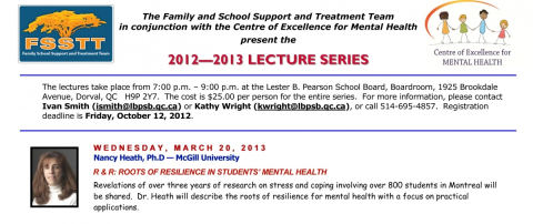 Revelations of over three years of research on stress and coping involving over 800 students in Montreal will be shared. Dr. Heath will describe the roots of resilience for mental health with a focus on practical applications.