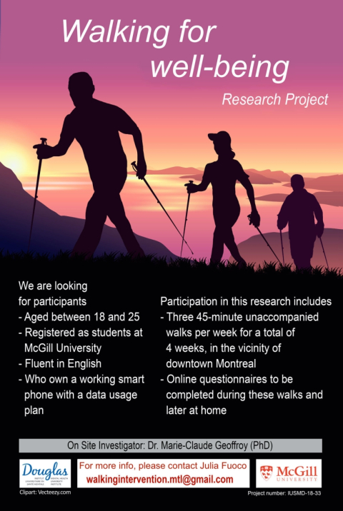 Dr. Marie-Claude Geoffroy's research team is in search of participants for a walking for well-being research project in the vicinity of downtown Montreal!