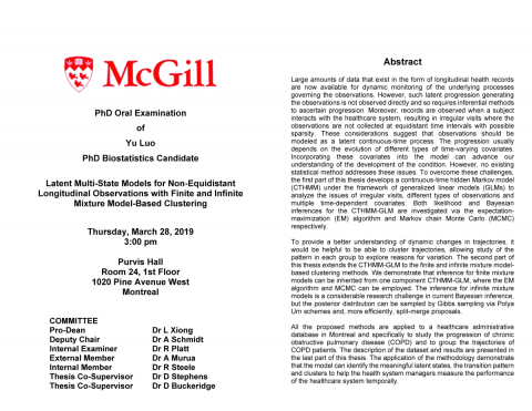 PhD Oral Defense: Yu Luo: Latent Multi-State Models for Non-Equidistant Longitudinal Observations with Finite and Infinite Mixture Model-Based Clustering