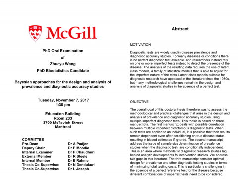 PhD Oral Defense: Zhuoyu Wang: Bayesian approaches for the design and analysis of prevalence and diagnostic accuracy studies