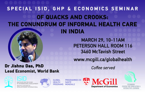 The Institute for the Study of International Development, McGill Global Health Programs and the Department of Economics are happy to present a special lecture by Dr. Jishnu Das, Lead Economist at the World Bank titled "Of quacks and crooks: The conundrum of informal health care in India".