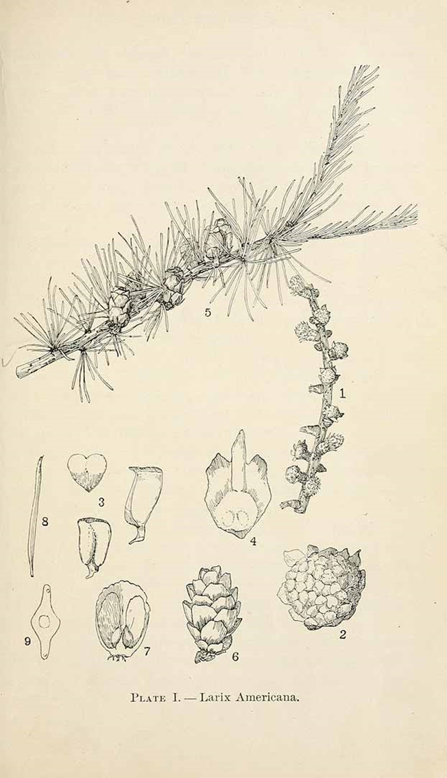 Tamarack is a needle leaved tree, but in the fall all of the needles fall off, after first turning a bright yellow. The needles are soft and fairly short (about 3 cm), and are borne in little bunches along the twigs. The new year’s growth has a different arrangement, with each needle borne alone. The cones are little and are born along the branches. The tamarack is a native tree; a European species, Larix decidua, which is more stately, is often planted in Montréal, and has established wild populations in much of South-Eastern Canada, but it is not considered invasive.