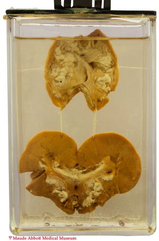 Lancet) is a transcript of a lecture he gave on May 28, 1881 as part of the "Summer Session Course". In it, he mentions a case of "very great atrophy of one kidney and a large red state of the other"; it is unclear if he is referring to specimen 54. An addendum at the end of the publication gives some follow-up on the patient discussed at the beginning of the lecture exemplifies Osler's characteristic style of writing.