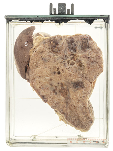 The specimen consists of a portion of the spleen (S) adjacent to which is a 17 cm tumor in the position of the tail of the pancreas. The tumor consists of innumerable cysts of variable size, most less than 5 mm in diameter. There is no evidence of necrosis or hemorrhage. The patient was a 46-year-old woman who complained of left upper abdominal quadrant pain. A hard mass was palpated on physical examination.