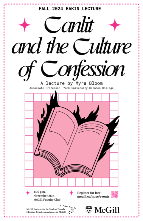 Rejoignez l’IECM à 16h00 le mardi 26 novembre au Faculty Club (3450 rue McTavish) pour la conférence Eakin d'automne 2024, Canlit and the Culture of Confession, prononcée par Myra Bloom.