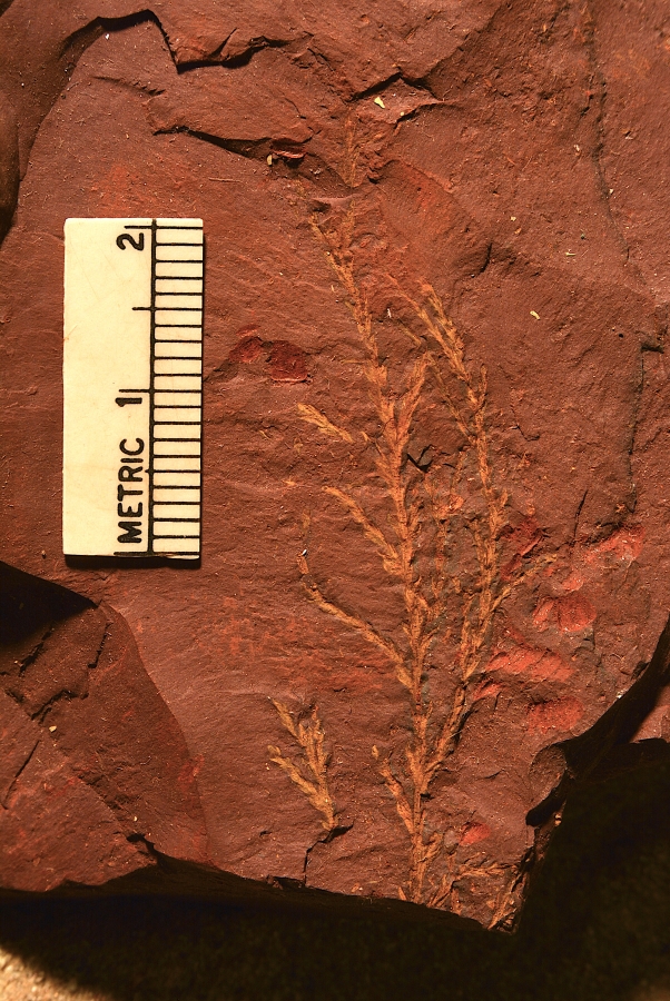 Conifer leaf assigned to Sequoia gracillima, curated at the Yale Peabody Museum of Natural History. Although they are rare in this particular fossil flora, conifers would have remained an integral part of Late Cretaceous ecosystems alongside flowering plants.