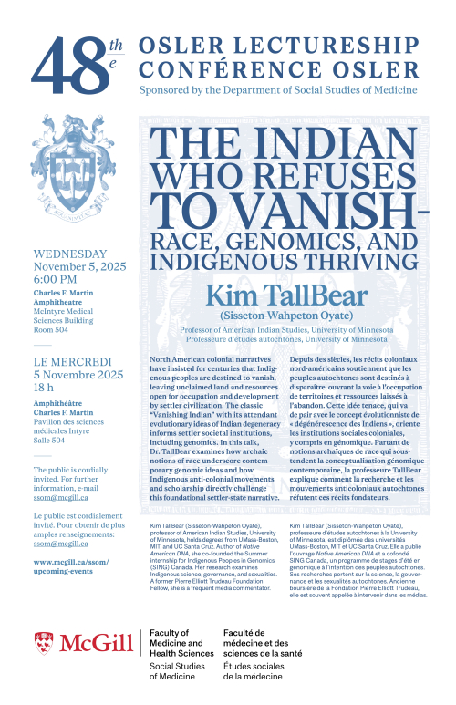North American colonial narratives have insisted for centuries that Indigenous peoples are destined to vanish, leaving unclaimed land and resources open for occupation and development by settler civilization. The classic “Vanishing Indian” with its attendant evolutionary ideas of Indian degeneracy informs settler societal institutions, including genomics. In this talk, Dr. TallBear examines how archaic notions of race underscore contemporary genomic ideas and how Indigenous anti-colonial movements and scholarship directly challenge this foundational settler-state narrative.